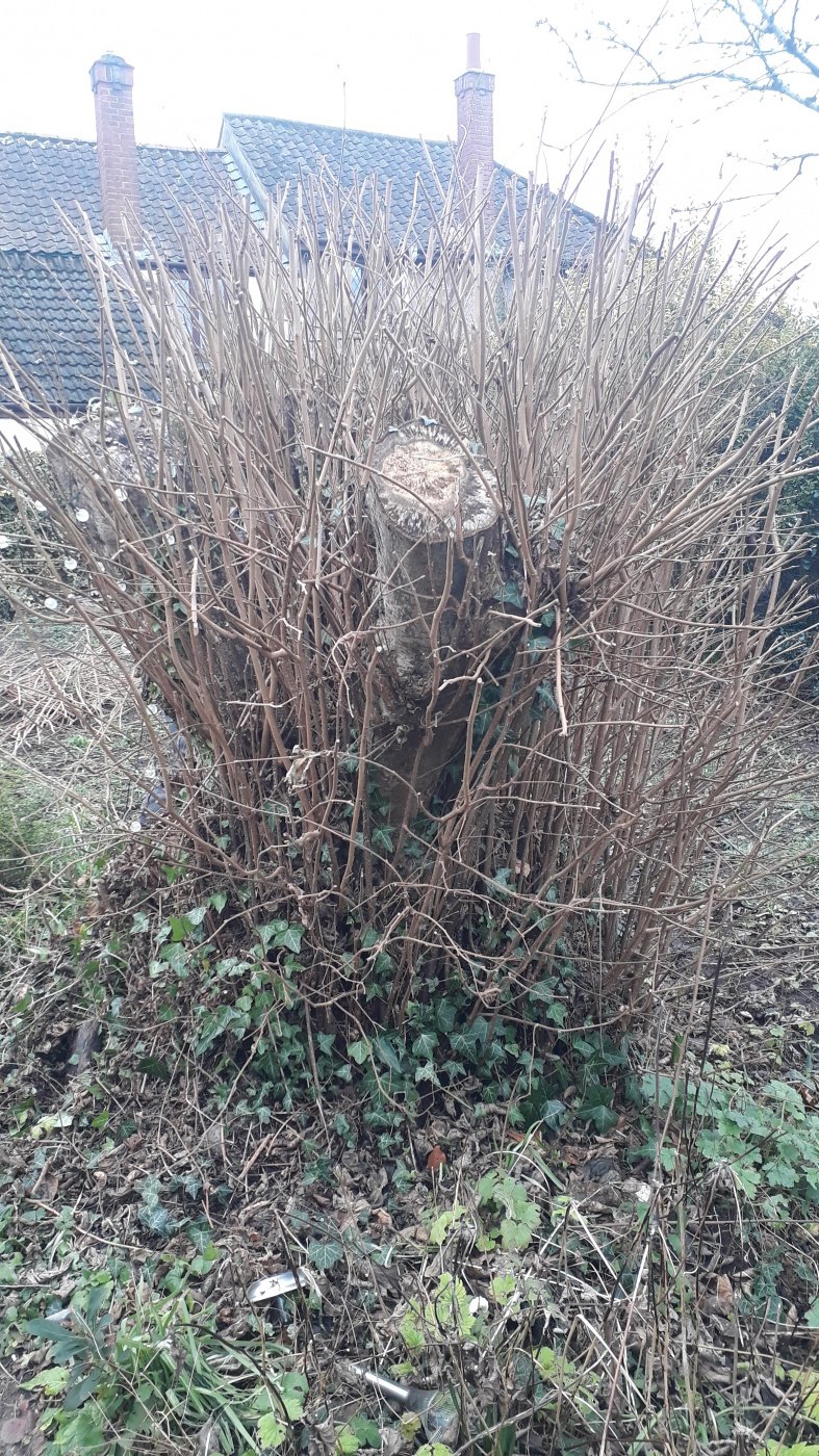 We've just moved into a new place with a garden. There used to be a huge hazel tree but it has been cut down- it wasn't cut to a stool for coppicing- it almost looks like it's been pollarded (photo attached)