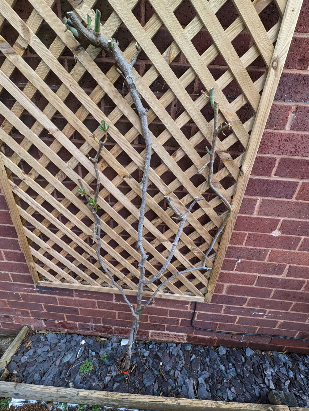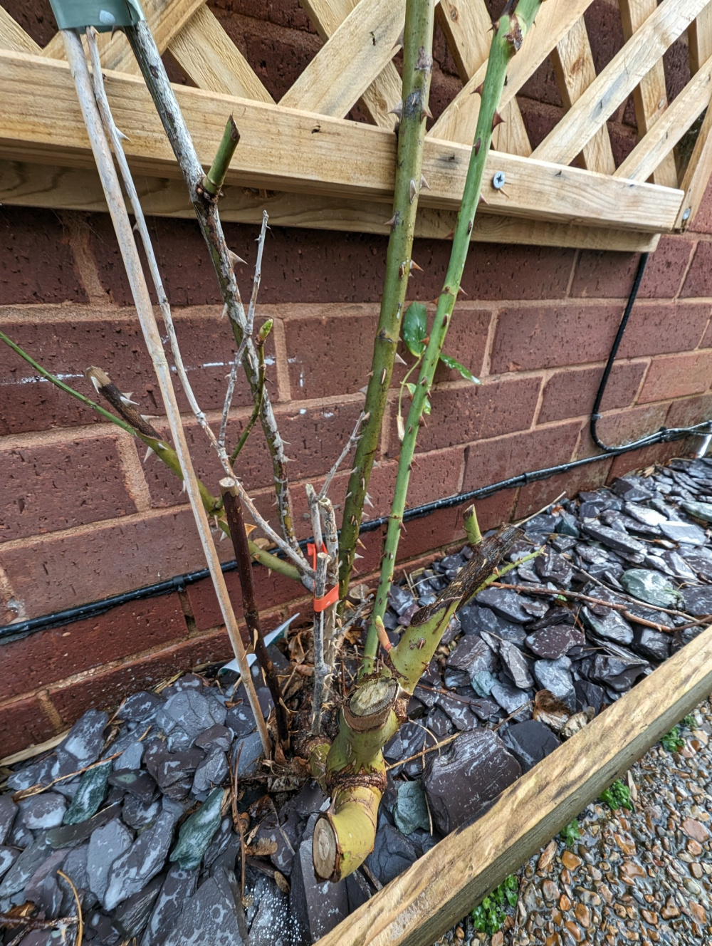 I think you need someone more expert than me to tell you what to do about that one long cane. Maybe @Nollie or @Marlorena could advise. However, I can say that roses don't like being mulched with slate or stones. They like compost or rotted manure and they like rose food in March and after the first flowering. That will be difficult to do with all that slate there.