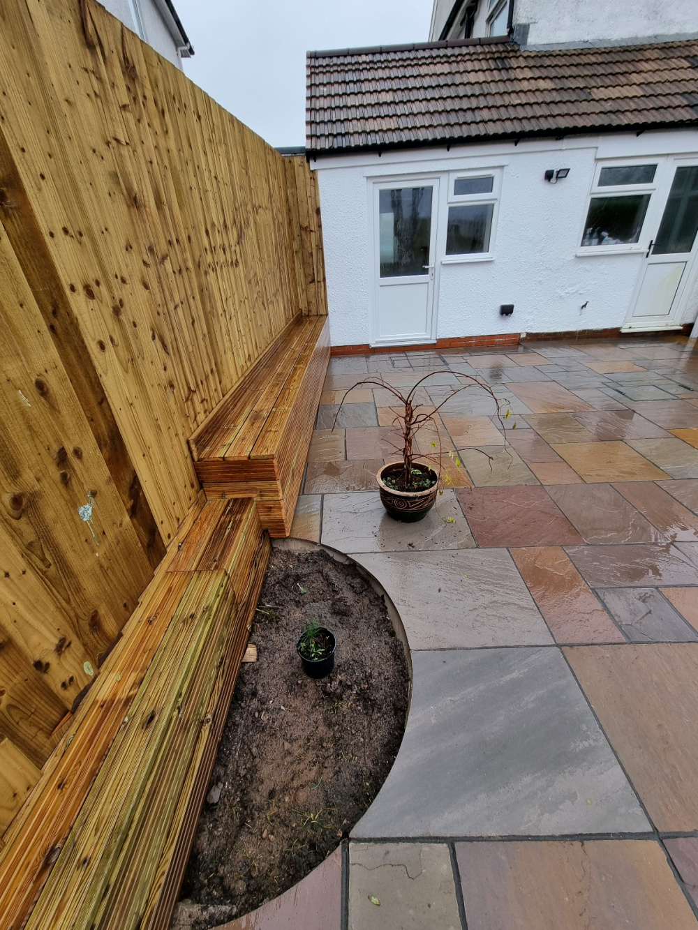 (b) the patio (the portion where this hole is located is built on a hardcore base, and the part nearer the house is built on a concrete base where the old patio was located)