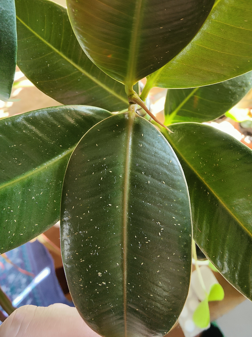 Could be white fly. Brush them off with a small soft paint brush or take a damp paper towel and rub the leaves gently with it or spray it with a bug killer. If it is they love indoor plants.
