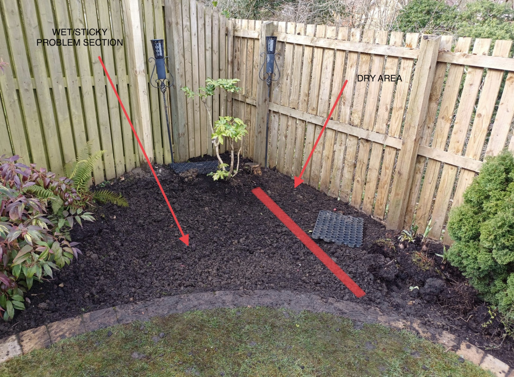 For several years, I grew conifers which meant the area was fine - but since I cut them down (they got huge), it’s turning back into a sticky mess. It didn’t helped when I rotovated it all into a clay soup. Oops. At that point I dug in about 5 x 50 litre bags of manure in the hope it would help.