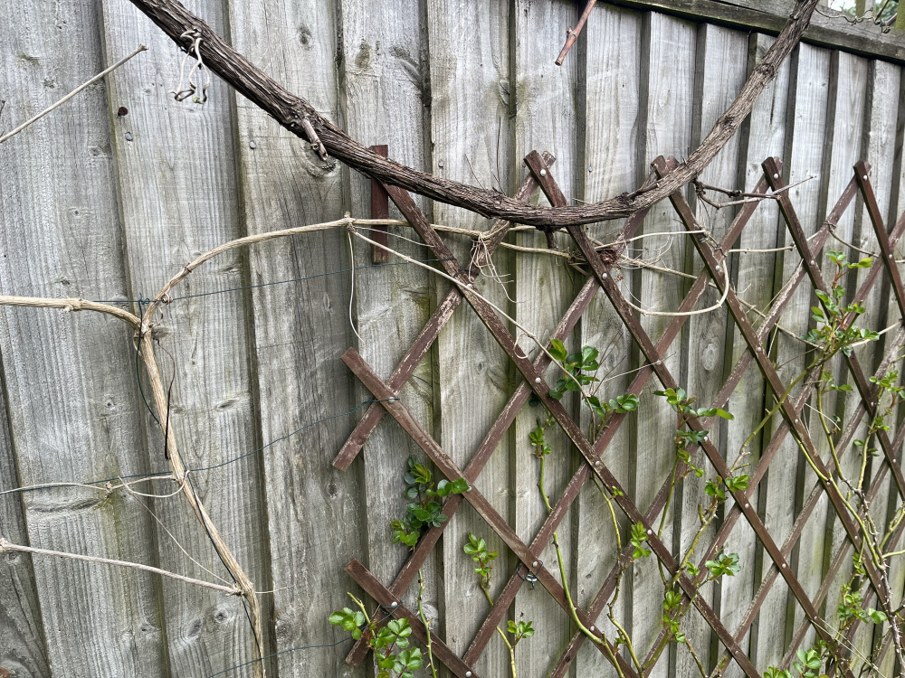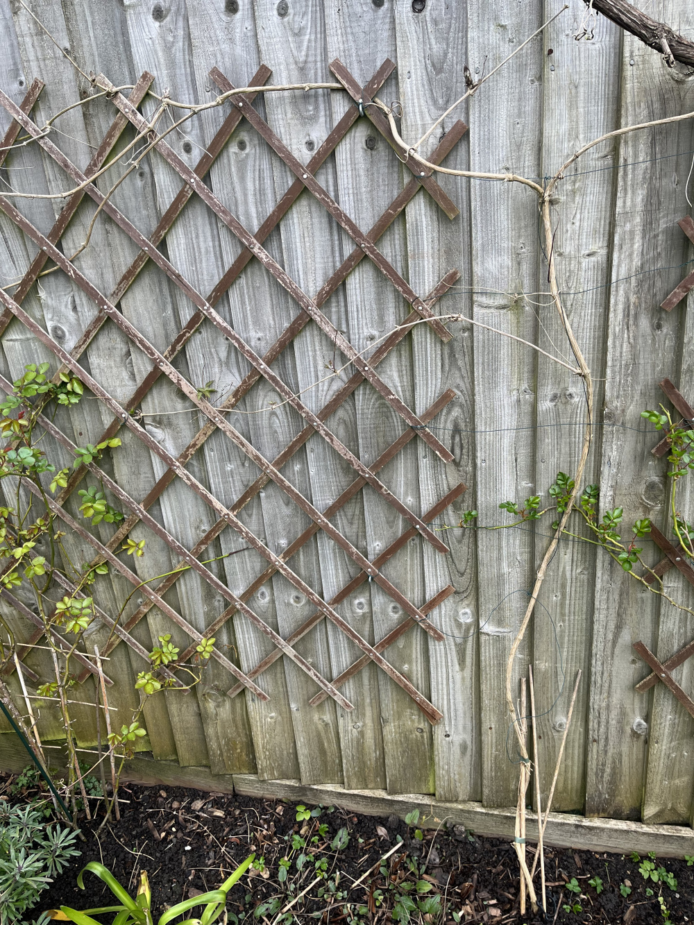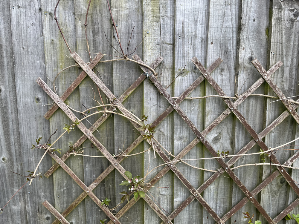 I agree re the trellis . Might as well change that now. If the fence is sturdy, you can use wire and vine eyes. I've done that with montanas in the past - I had one at the back door in a previous garden, so some of it was arranged round that, and some stems trained along a fairly low fence, to the back gate, and up over a small pergola type entrance there. You can certainly take off anything weak and spindly. It's also worth making sure the soil is in reasonable condition for it - some mulching now and again, but they can also take a few years to get going. They'll grow in quite poor, drier conditions too. If it's not thriving, and it does look like a pretty weak specimen, it may simply have been quite pot bound to start with - or one of those 'teabag' plants*, which are dreadful for things like clematis. I've lost several because of that, and only discovered they were grown that way after they'd failed.