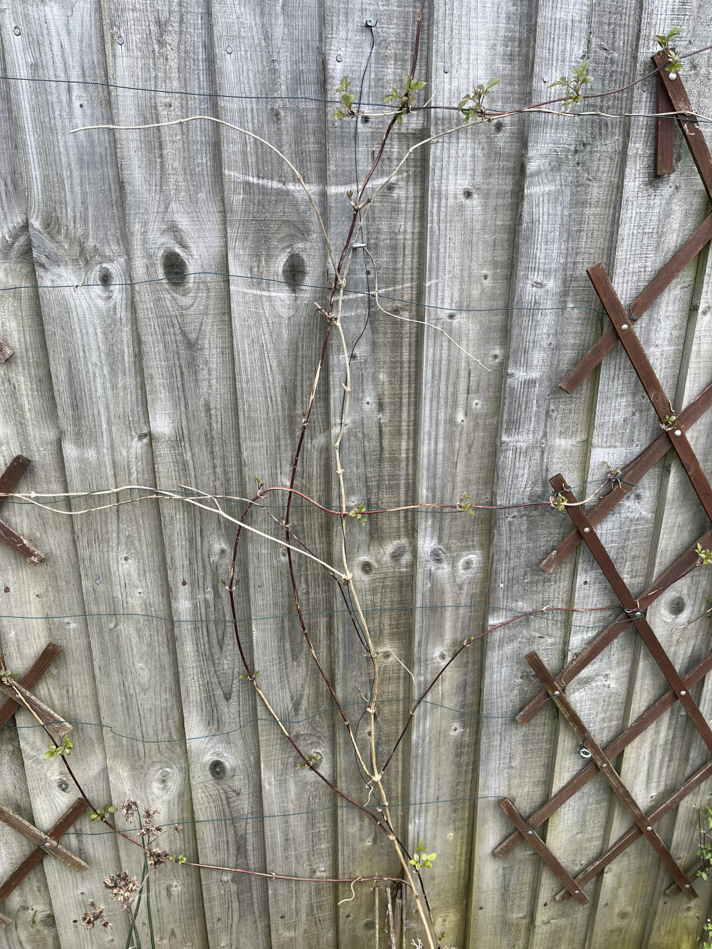 There is a but here. You have done a nice job of tying in the shoots horizontally. But I would cut them all or most back to the main stem to persuade it to shoot from nearer the base.