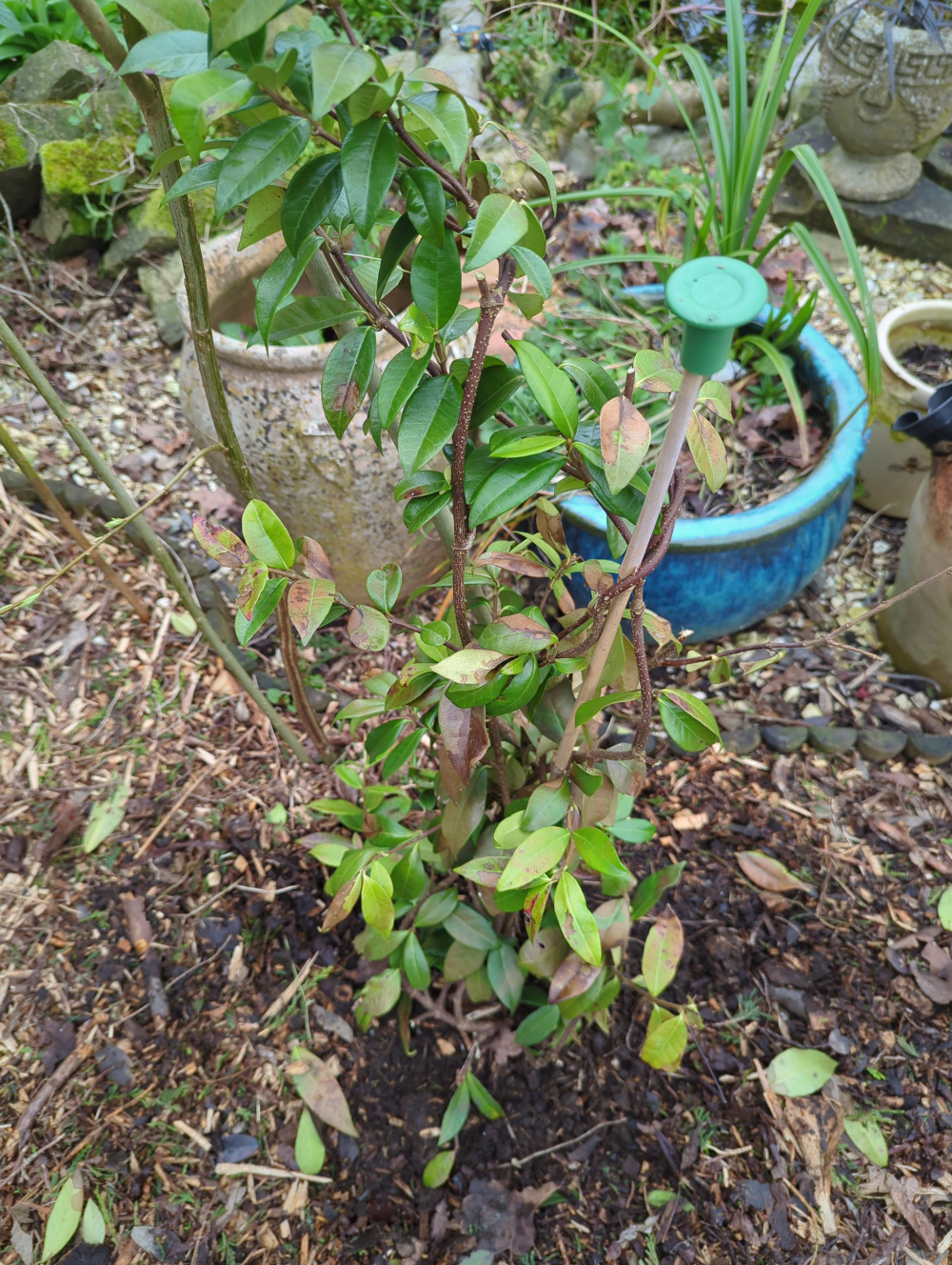 I just wanted to ask a question about this star Jasmine I bought last year. It's not in the best place but get sun and partial shade and I wanted it to grow up the living willow wall. I still haven't got around to training it up a metal obelisk for the time being and to be honest I really should have brought it in over winter or planted it in a pot. I did cover it during very cold spells but there is a lot of debt leaf matter though. They're on you shoots when scratching the bark. It is green underneath but I don't know whether I should cut quite a lot back or uproot and put in a pot or even move somewhere else. Or maybe I should just leave it for the coming season? Any advice greatly appreciated. Best James