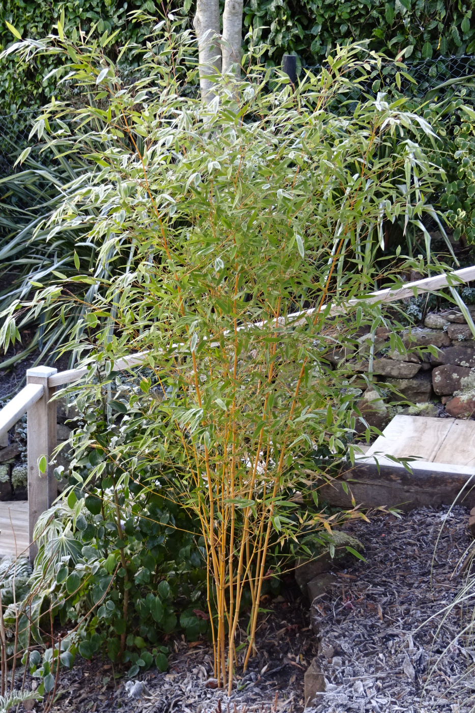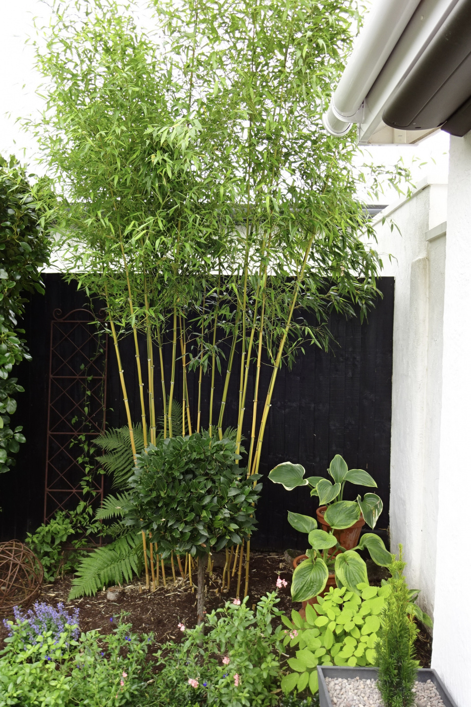 I might plant a more substantial bamboo behind it. By early summer, the trellis will have filled out with climbers too, so it will probably be ok.
