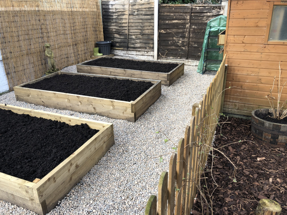 Chris, if that tree is a willow, I would suggest you have it removed asap. They are notorious for problems with drains and house foundations and that looks far too close. It will also suck up all the moisture and cast shade over your new raised veg beds.