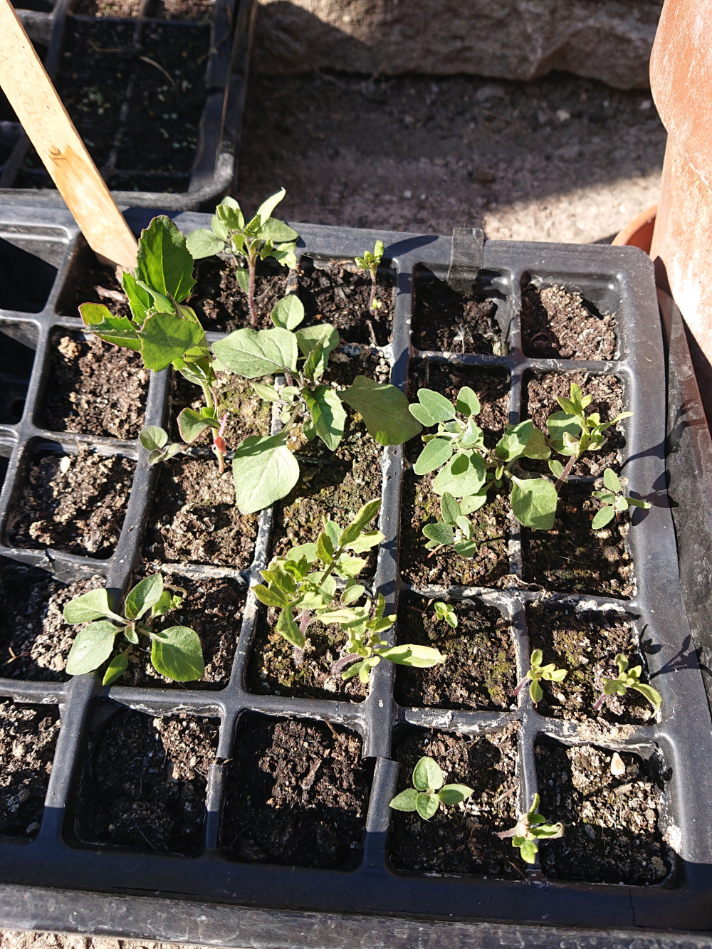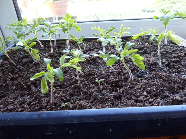 Well, my seedlings have come on since I last posted a picture. Now, 25 days after planting seedlings about 3" tall in about 2" of compost. Although the instructions on the back of the seed packet say to plant out when 10 - 15 cm tall (4-6") I'm wondering whether to pot up now as they look as if they'll be hard to separate without damaging them if I leave much longer....mm...How advanced are your seedlings, Andy?