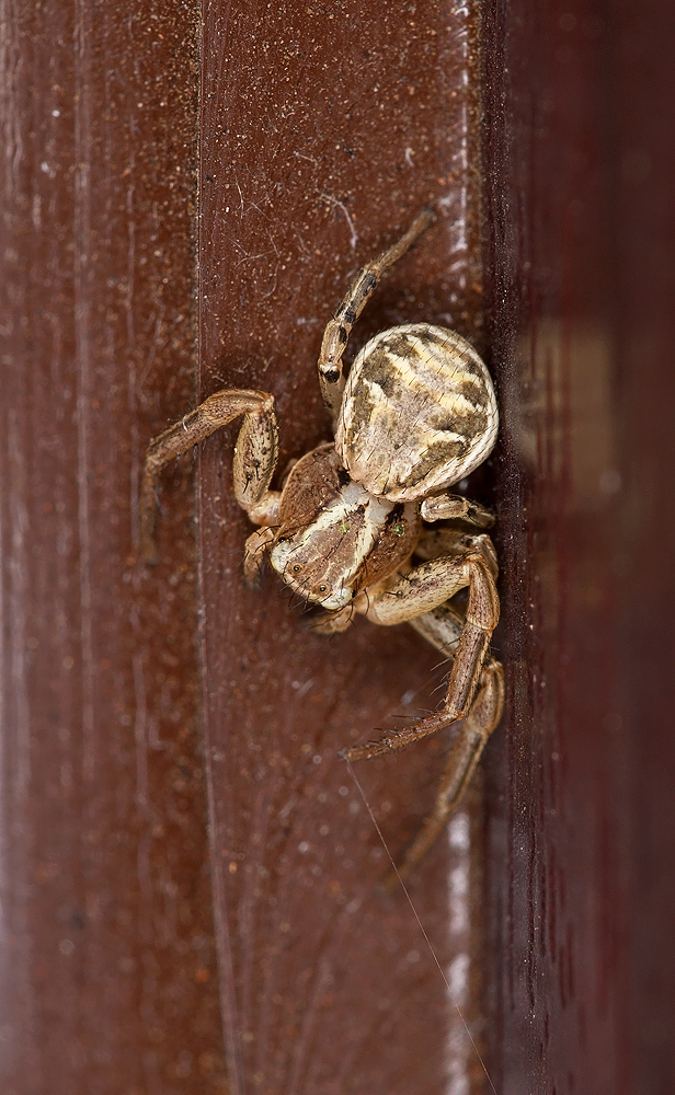 Resting by the backdoor this morning...one of the Common Crab Spiders...there are several that all look very similar, so I'm not going to guess as to which one it is.