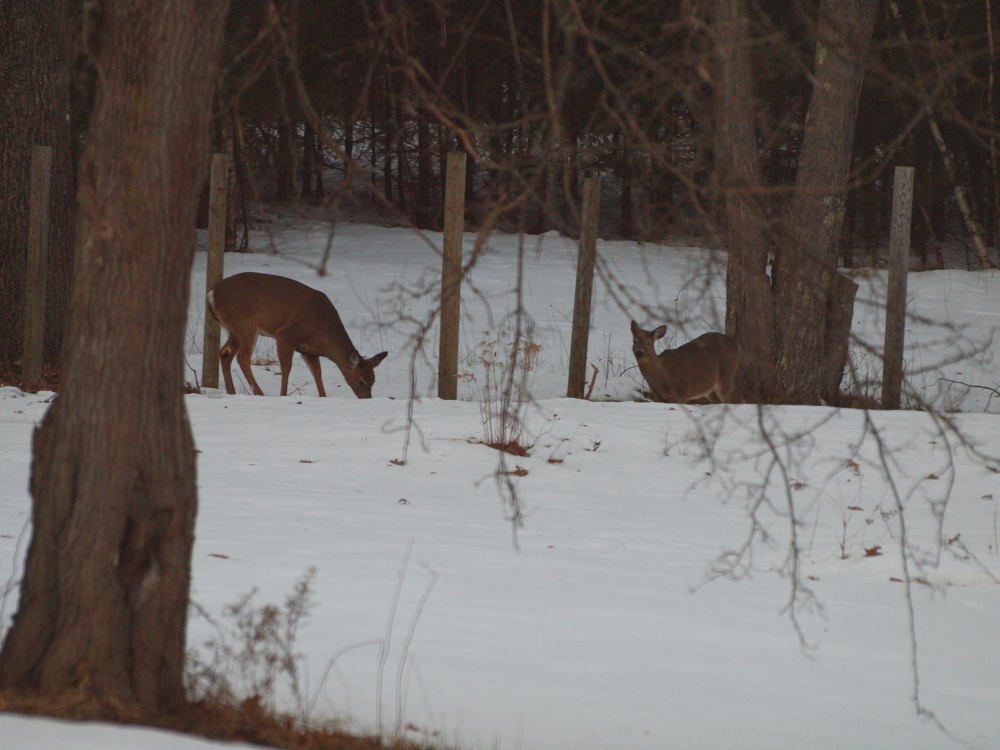 We've had a tame winter so the deer have remained mostly deep in the woods, but now that the snow pack is receding the deer are returning and tearing up the ground under the oak trees, going after the acorns.