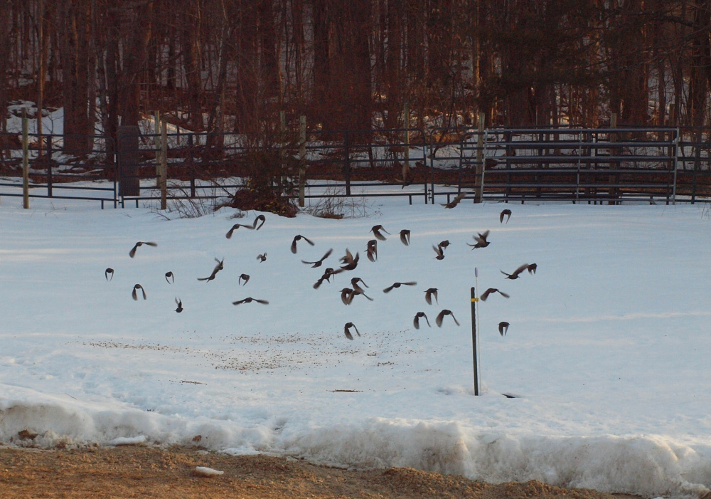 They're eating the dog kibble I soak for the crows, and when they get spooked they fly, en masse, up to the roof of my house. It sounds like it's pouring rain when they land! It's just so odd...no other birds land on my roof.