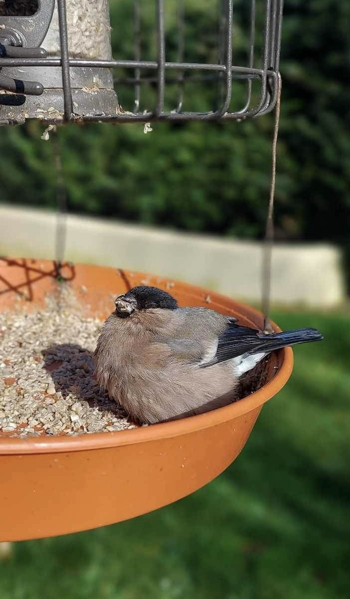 Very sad this morning to see a sickly looking female Bullfinch in the tray under my bird feeder. I noticed that she was looking very fluffed up and had been there for a while so I walked towards her hoping she’d fly off but she just sat there.
