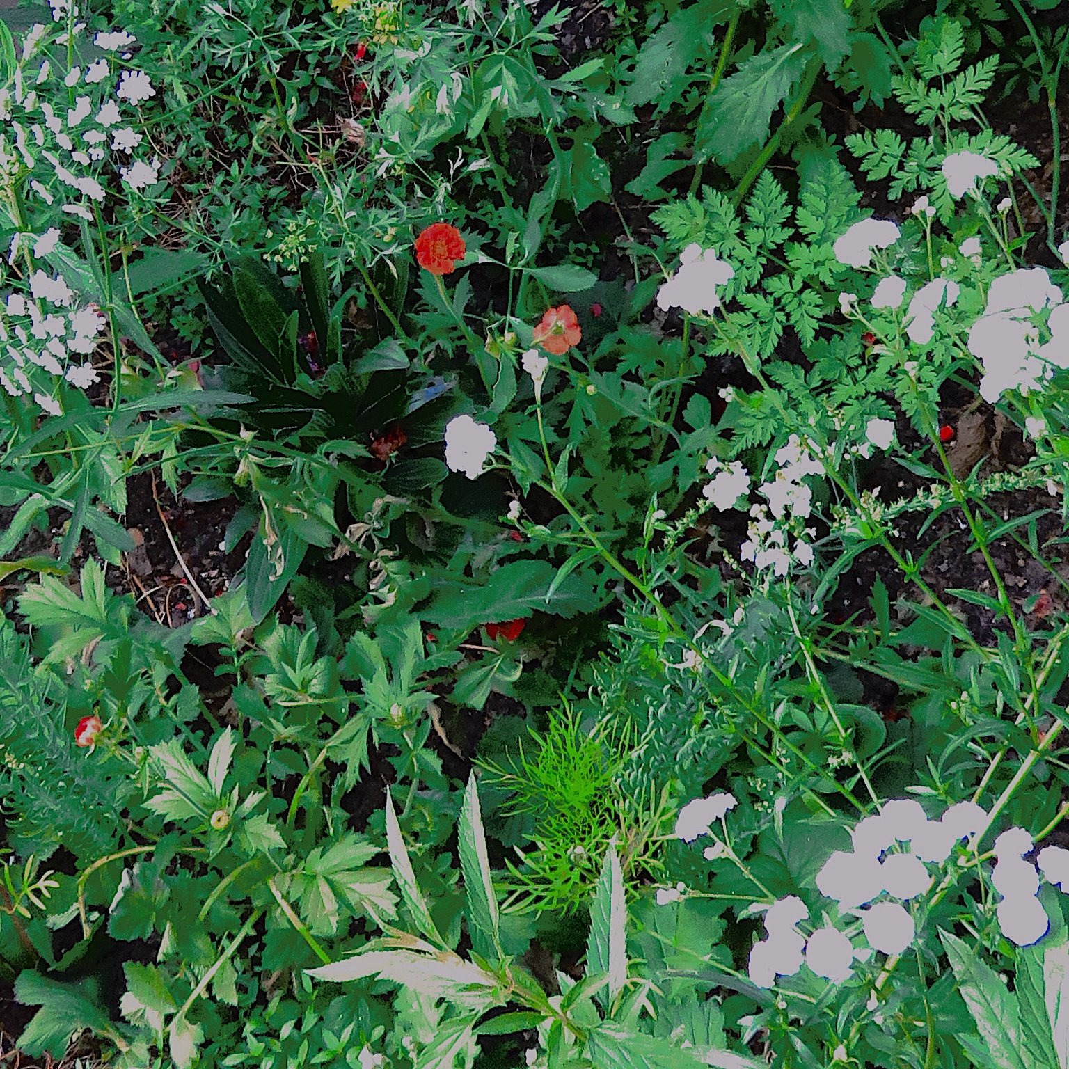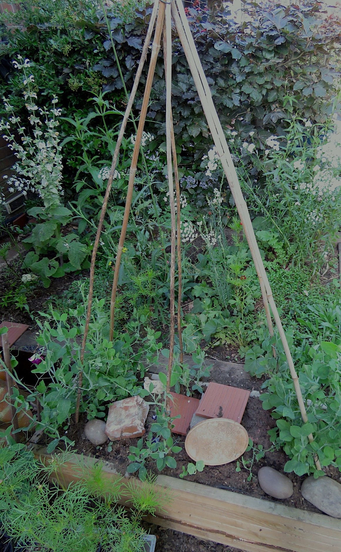 My sweetpeas in the side bed are just coming out, under planted with dark red nasturtiums. Cosmos will not be far behind, in the main bed, with more ready to go in. Geums (Mrs B ) are struggling with heat, but if I can keep them alive, they should rocket next year. I have lots of ammi and Perry's White which seem very happy. It's all a bit experimental at the moment. I'm hoping for great height by September. The rocks are to stop the bloomin' foxes digging the sweet peas out.